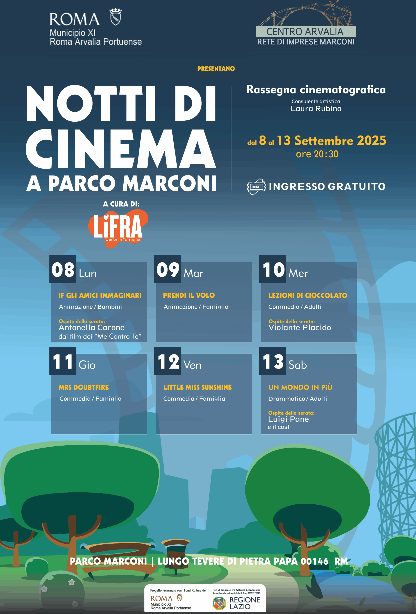 | TORNA IL CINEMA PER FAMIGLIE A MARCONI! Il Municipio Roma XI e la Rete Centro Arvalia – Rete di Imprese Marconi, sono lieti di annunciare la seconda edizione della rassegna cinematografica NOTTI DI CINEMA A PARCO MARCONI che si terrà nella splendida cornice del Parco Marconi, dall’8 al 13 settembre 2025. L’evento è curato da noi, l’Associazione LIFRA, che, come sapete, poniamo la massima attenzione per creare eventi dedicati a voi e a tuta la vostra famiglia. La rassegna, arricchita dalla consulenza artistica di Laura Rubino, offrirà una programmazione serale rivolta sia agli adulti che ai bambini. Ogni sera il grande schermo all’aperto del Parco Marconi diventerà il centro di un’esperienza unica, con una selezione di film dedicati alle famiglie. E, ciliegina sulla torta: l’INGRESSO E’ GRATUITO! Tra gli ospiti dell’evento l’attrice Violante Placido che presenterà uno dei suoi film cult Lezioni di Cioccolato, il regista e sceneggiatore Luigi Pane che introdurrà il suo primo lungometraggio Un mondo in più, che ha esordito ad Alice nella città nell’edizione 2021 e l’attrice Antonella Carone da i Me Contro te, testimonial della Rassegna bambini. Calendario delle Proiezioni: INIZIO PROIEZIONI ORE 20:30 ● 8 settembre Serata dedicata ai bambini “IF – AMICI IMMAGINARI” OSPITE ANTONELLA CARONE dai “Me contro te” ● 9 settembre Serata dedicata ai bambini “PRENDI IL VOLO” ● 10 settembre Serata dedicata agli adulti “LEZIONI DI CIOCCOLATO” OSPITE VIOLANTE PLACIDO ● 11 settembre Serata dedicata alla famiglia “MRS DOUBTFIRE – MAMMO PER SEMPRE” ● 12 settembre Serata dedicata alla famiglia “LITTLE MISS SUNSHINE” ● 13 settembre Serata dedicata agli adulti “UN MONDO IN PIU’”OSPITE LUIGI PANE Il Parco Marconi diventerà il cuore pulsante di questa iniziativa, offrendo un’ambientazione suggestiva per trascorrere le ultime serate estive all’insegna del cinema e della cultura. Vi aspettiamo numerosi per godere di questa esperienza indimenticabile sotto le stelle! |